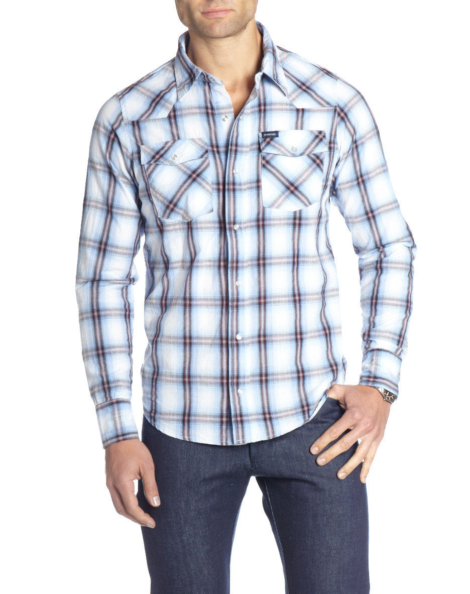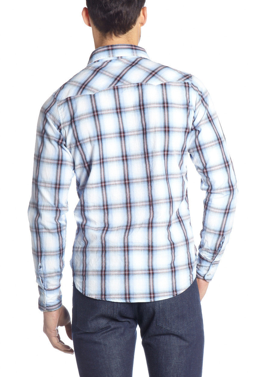 Our LIMITED EDITION reissue of our plaid pearl snap that we launched our brand with 10 yrs ago. Straight from the Crawford Ranch, here's a classic western shirt in navy and light blue ombré plaid. Authentic details include pearl snaps and bias yokes. The shirting is a high quality deadstock, vintage 100% cotton fabric. Hand-crafted in California.