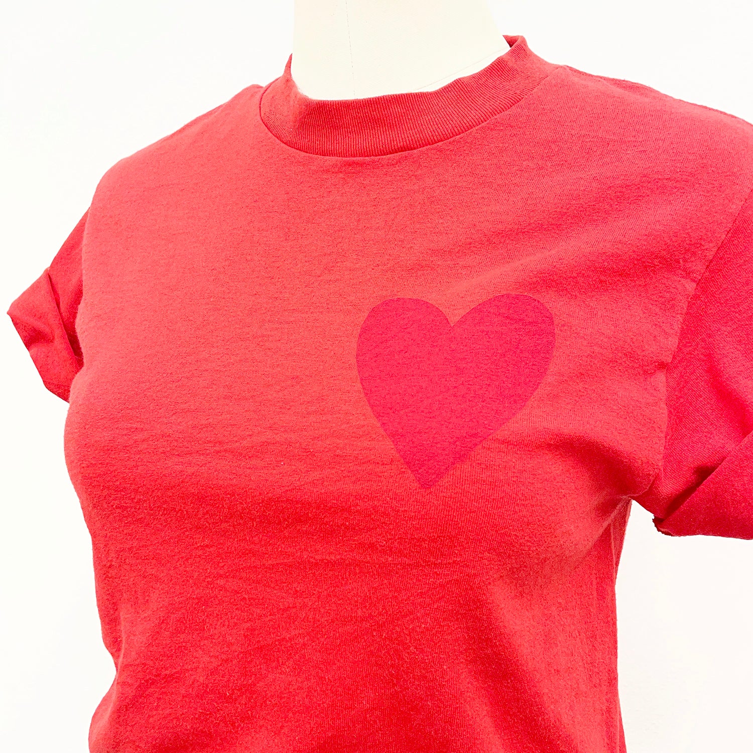 The Happy Heart Tee is hand printed with a dark red heart at the chest on the cherry red tee. Screened on vintage tees, each piece is unique with minimal wear. Any wear marks or pinholes are shown in detail images.