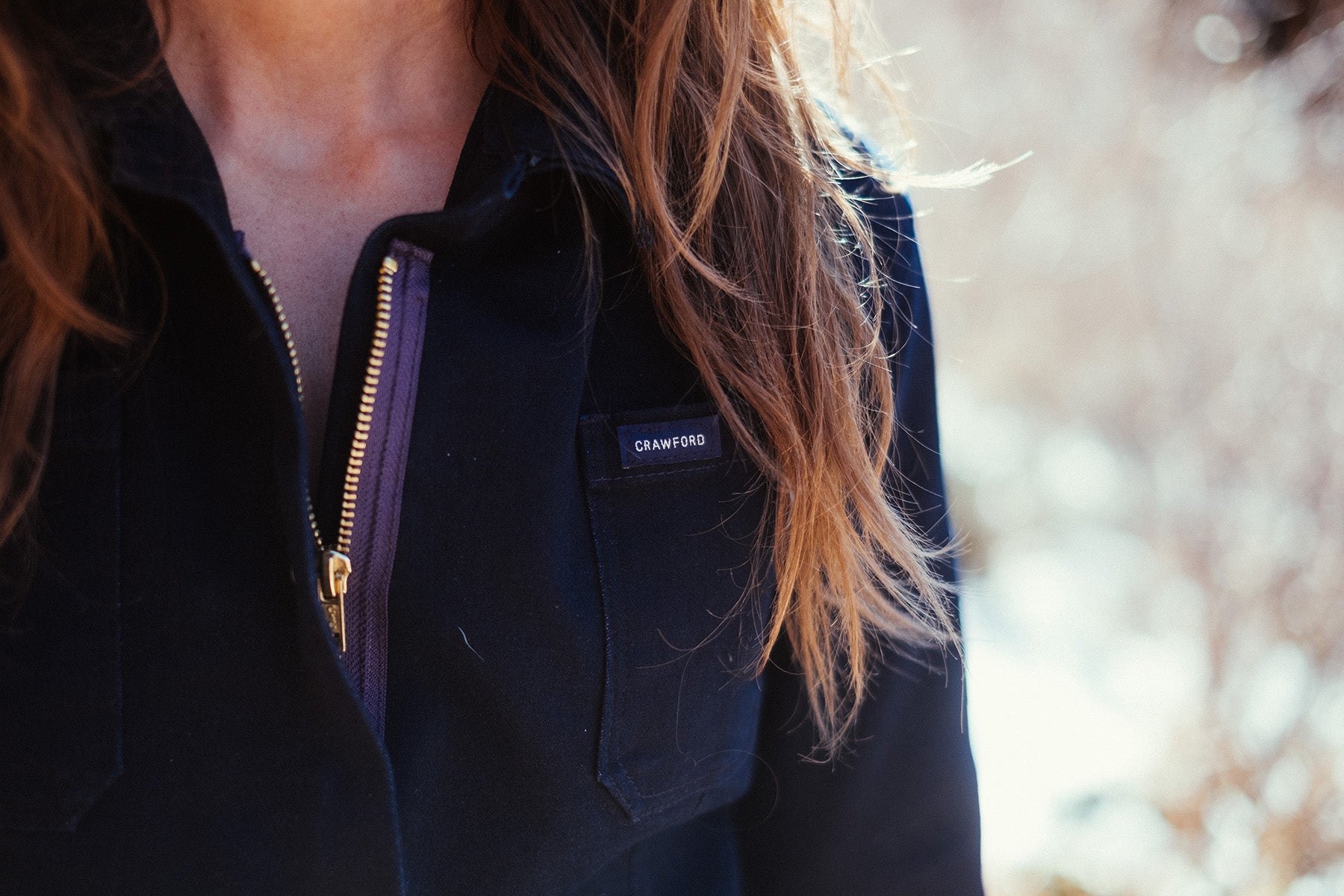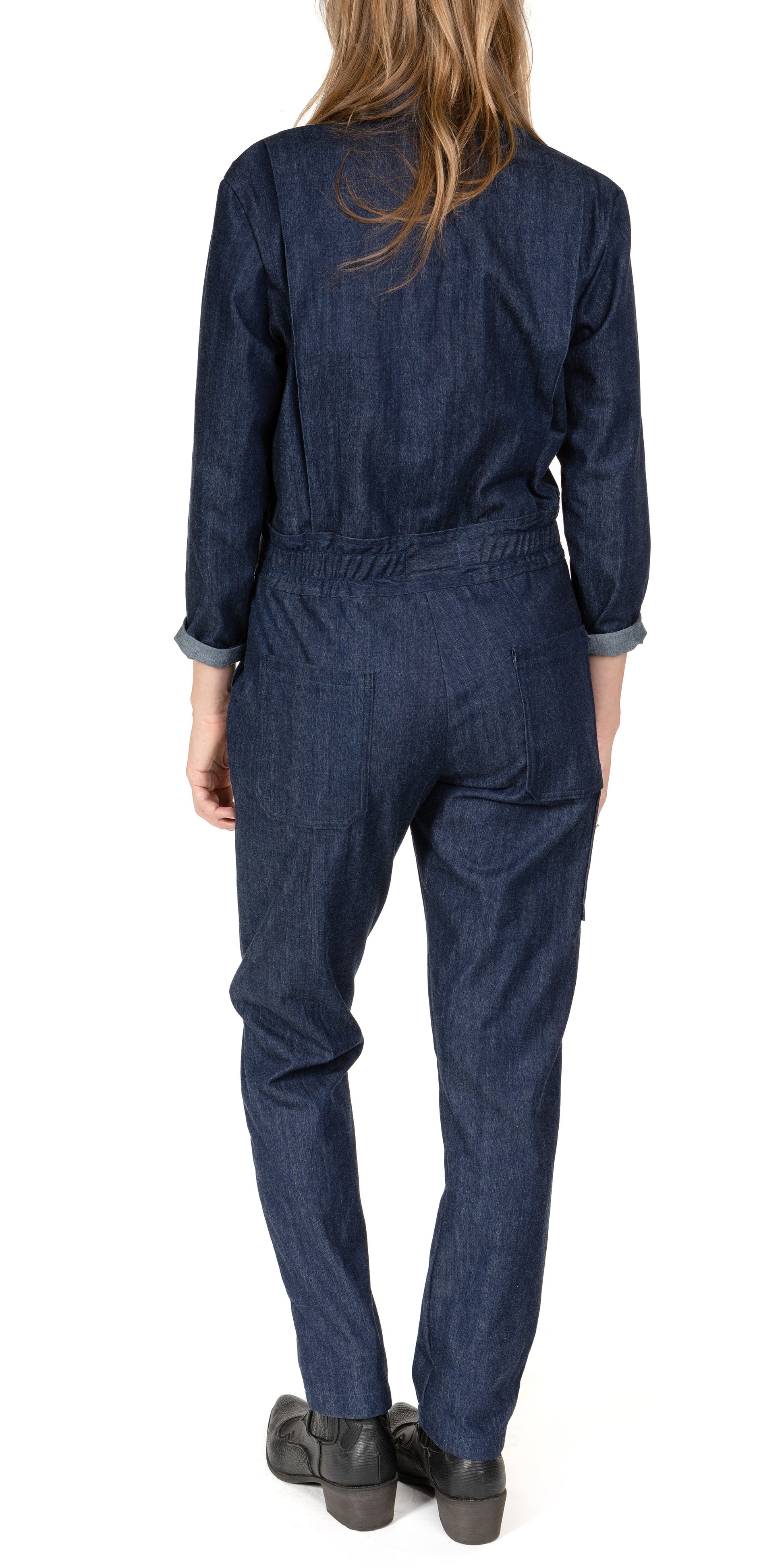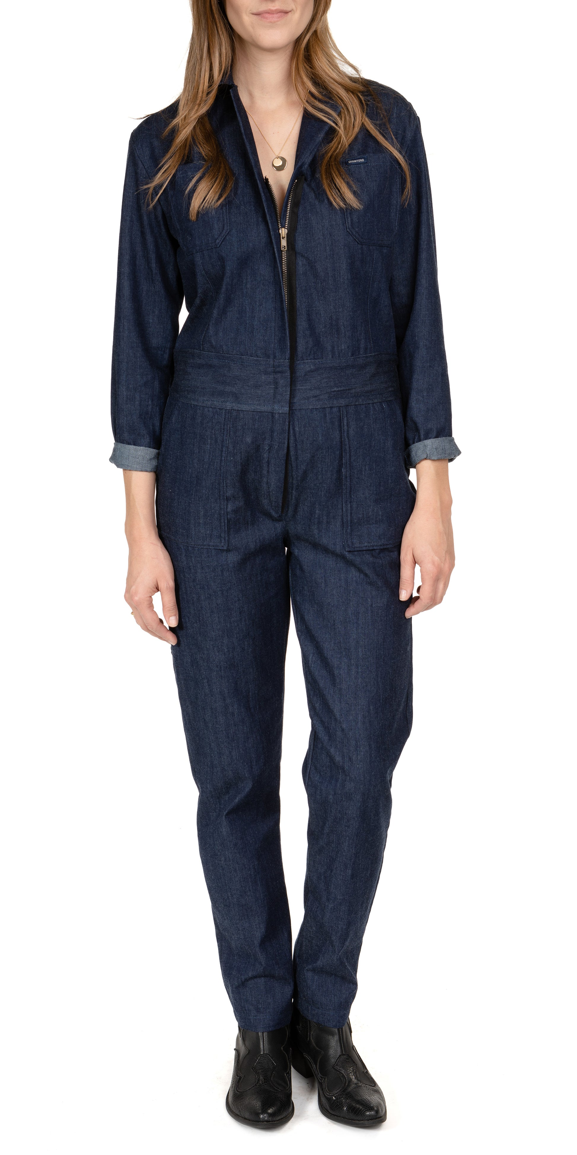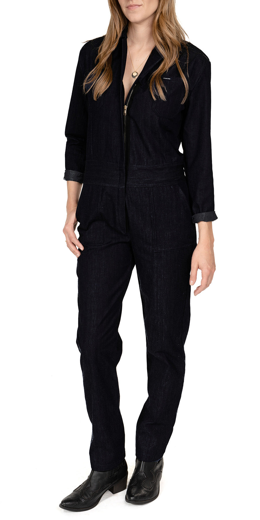 Limited Edition COVERALL is the ultimate one-piece in fashion. Our Coverall is built from a heritage mechanic's style. Relaxed through the body and an elasticized waist makes this jumpsuit an easy fit. Single back hammer pocket and back body pleats follow traditional details, while front panel darts modernize the silhouette. Sized in XS, S and M. Available in Solid Black Twill, Natural Slub Canvas or Dark Indigo Denim, all with spandex. Full length brass zipper with black or khaki tape. These limited edition pieces are hand-crafted in California.