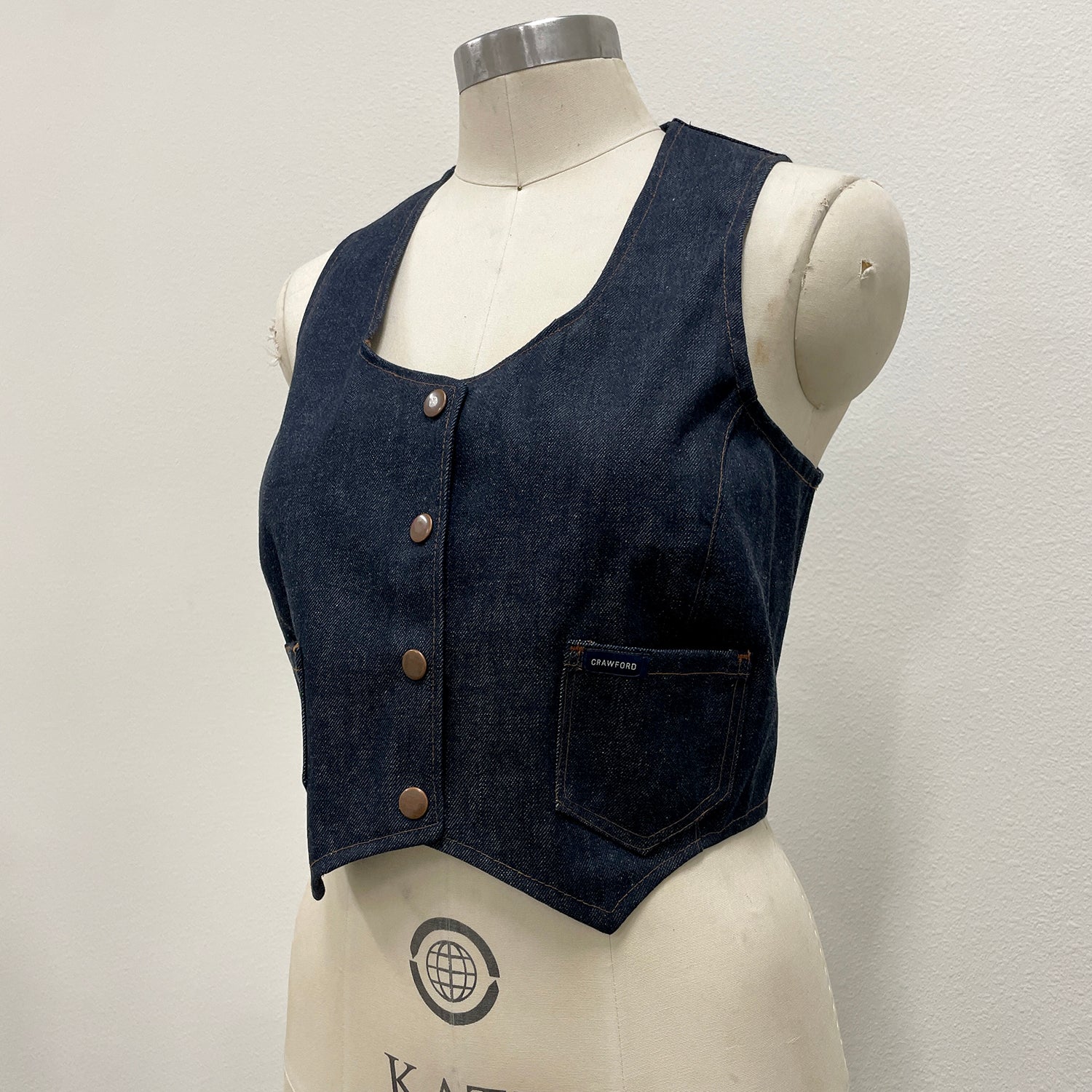 The Easy Vest ... made from raw dark denim is our signature silhouette this season. Based on a 1970's garment, we've recreated this for today's woman. Mini spade pockets at the front panels. Princess seams at front and darts at the back create a fitted silhouette. Easily worn without anything underneath or can be layered over your favorite top. Hand-crafted in California.
