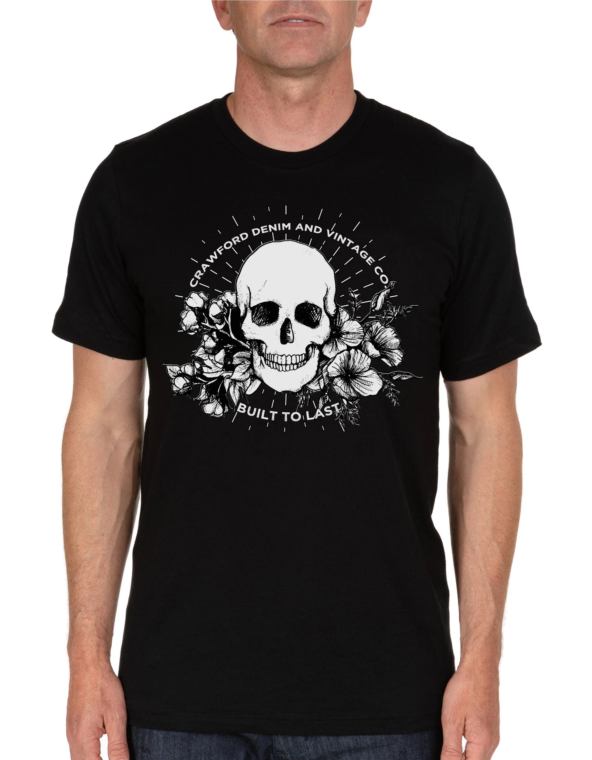 Built to Last ... our product is hand-crafted with quality goods. Our skull flanked by cotton and California poppies represents our commitment to building product that will out live you. White screen printed logo on black ground cotton tee.