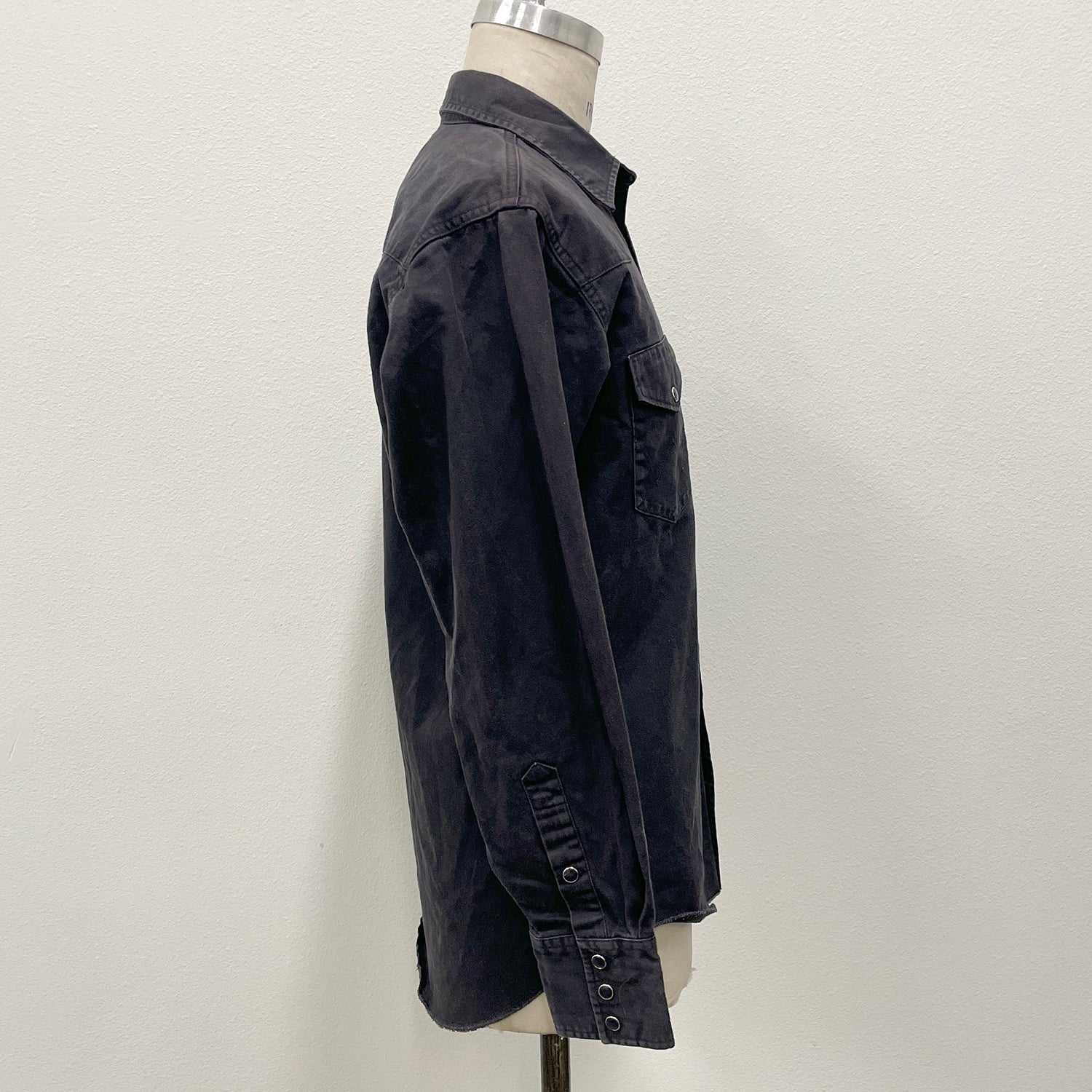 The iconic hard working man's Western shirt from Wrangler. Black pearl snaps at the front placket, pocket flaps and sleeve cuffs. Worn in at the seams to create the perfect contrast hi + low in the seams, against the solid black twill panels. In great condition.
