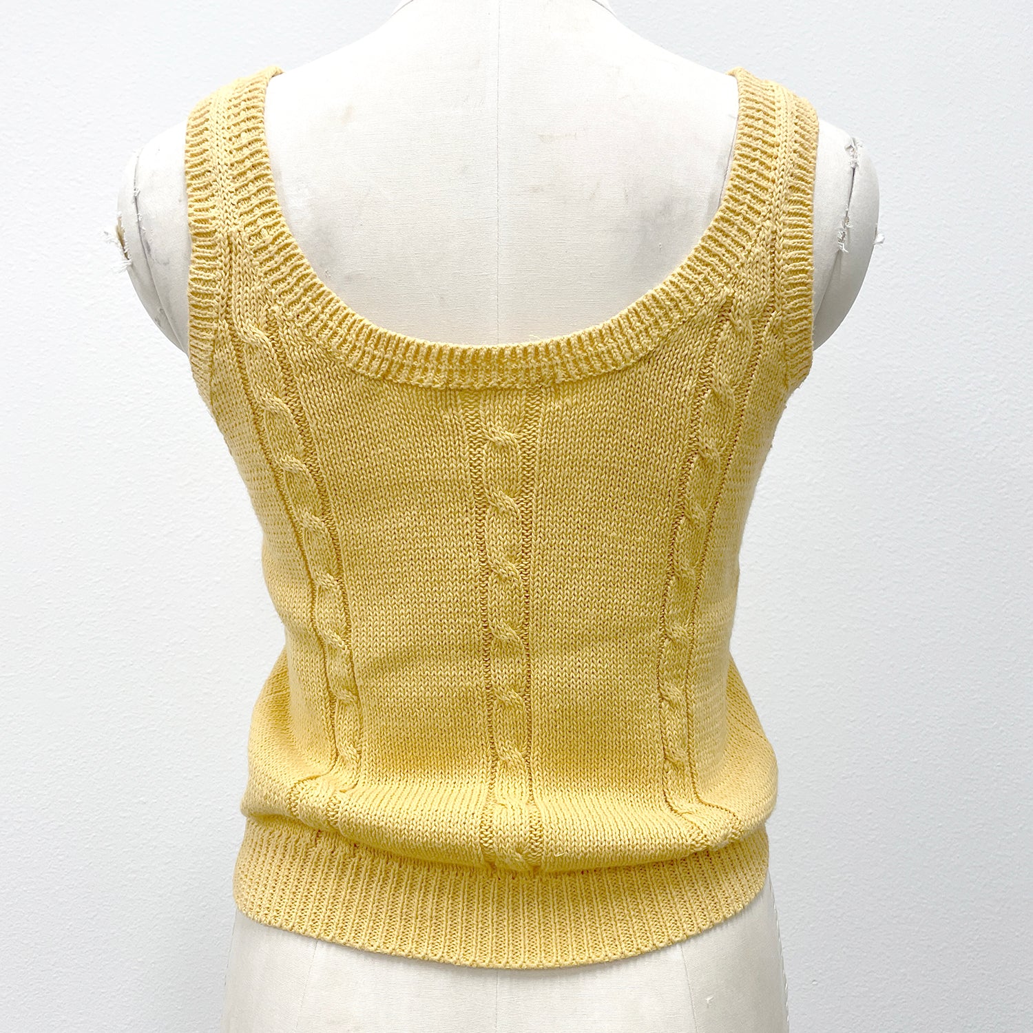 A cute yellow cable knit tank from the 1980's. Made by Gloria Vanderbilt with a trio of cables at front and back panels. A knit bow laced through the neckline and straps. In great condition.