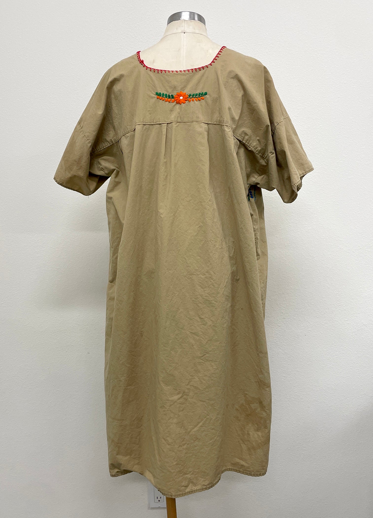 Love this punch of multi colored embroidered on the neutral khaki ground of this Caftan. The vintage shift dress looks great belted for an easy day of strolling in the sun. In good condition.