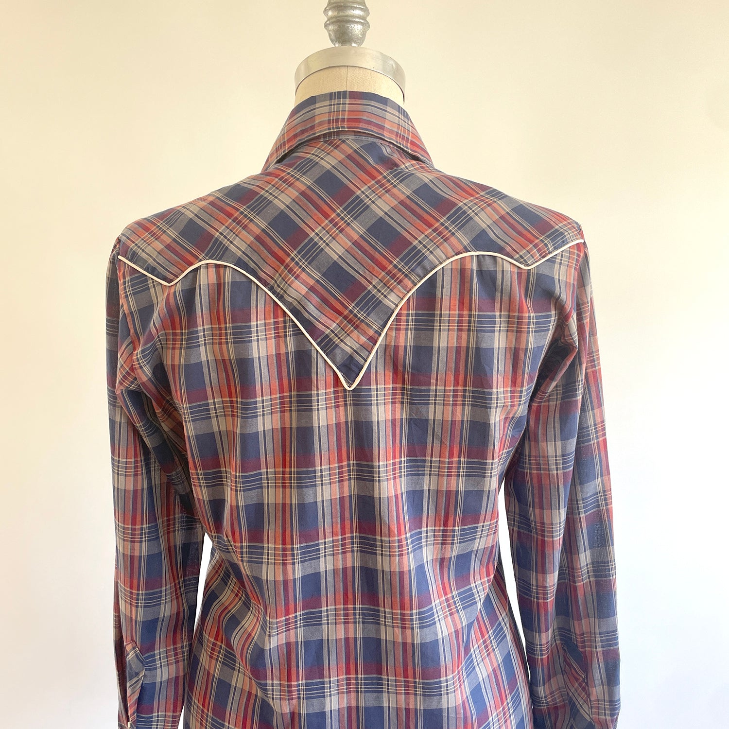 From the original Miller's Outpost, this western shirt was a staple in the 1980's wardrobe. Contrast white piping along the front and back yoke curves. Bias cut navy, dark red and pale grey plaid along yokes, pockets, cuffs and front placket to add subtle detail to this shirt. Solid blue pearl snaps at front placket, pocket flaps and sleeve cuffs. In great condition.