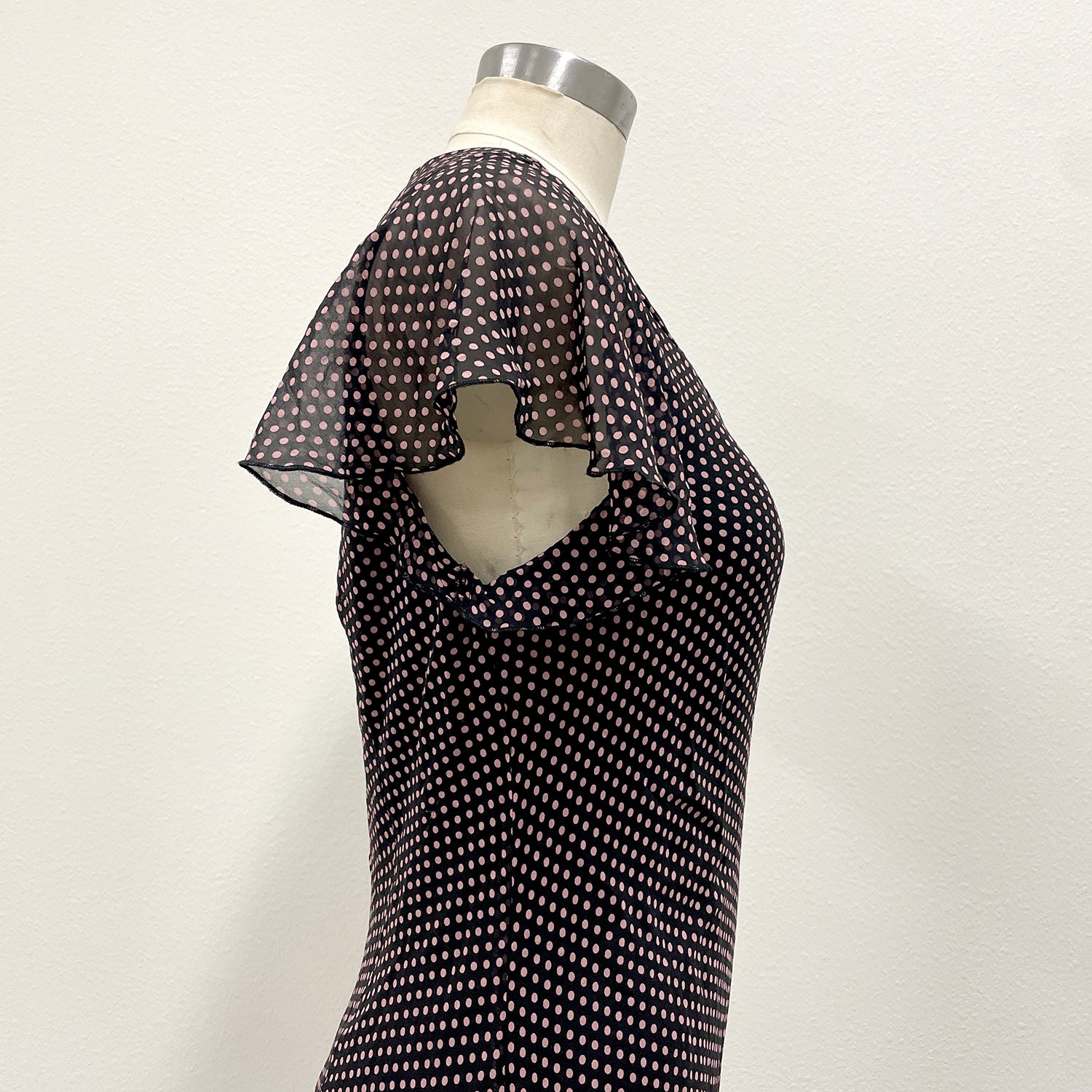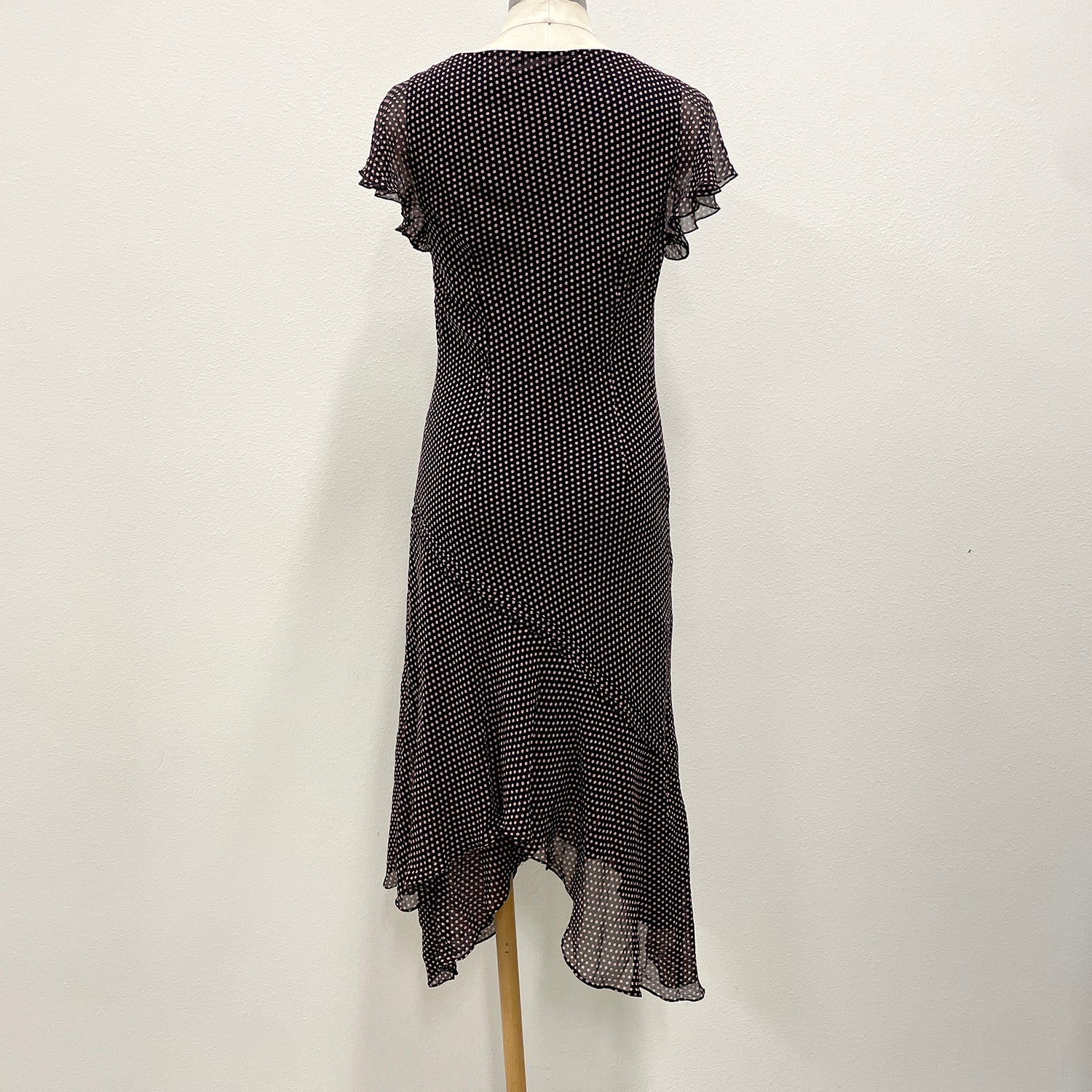 Let's look cute! This 1990's pin-tucked and polka dotted confection is a great little dress. The ruffled cap sleeves and handkerchief hem is delightfully flattering. The bias cut of the black ground rayon fabric makes it easy to slip on. The front v neck and back panel are pintucked along the seam lines. In great condition.