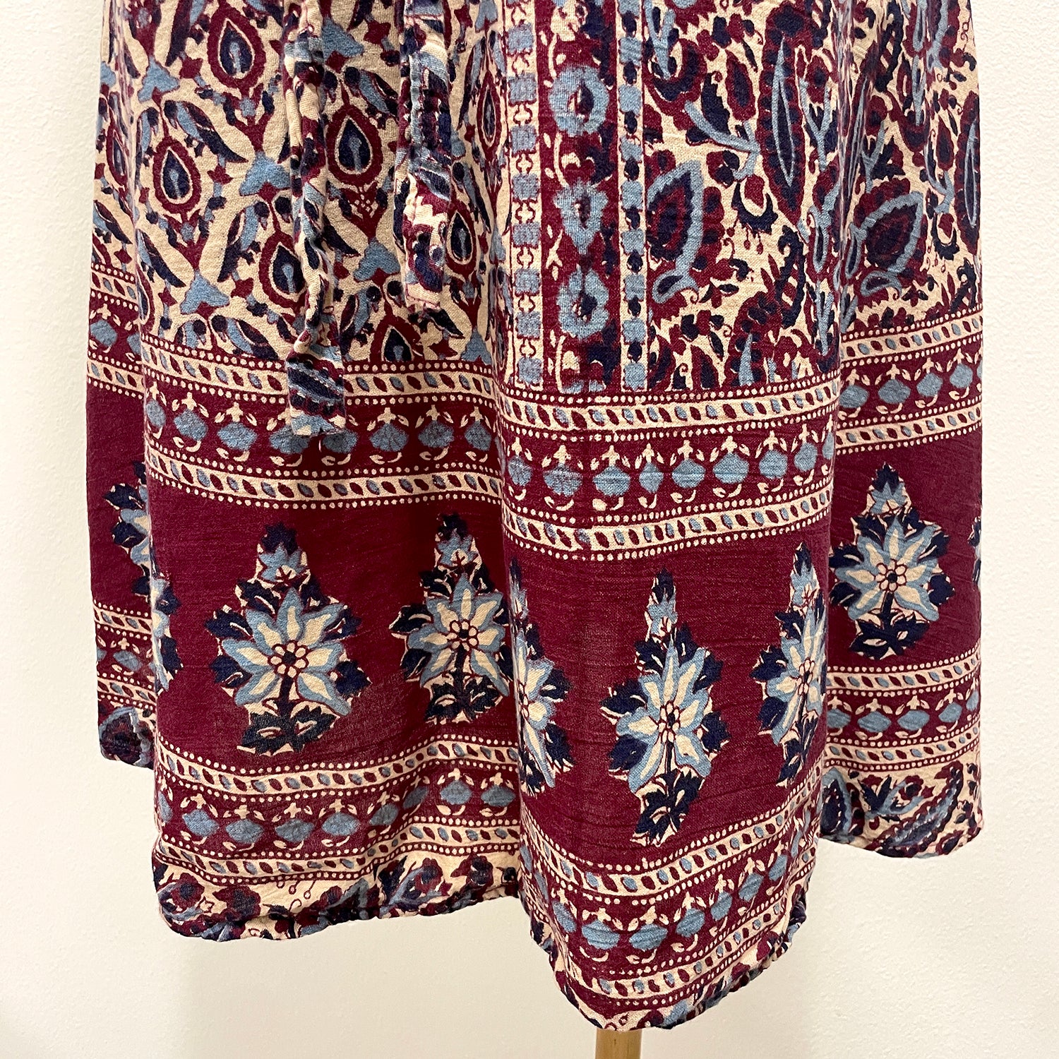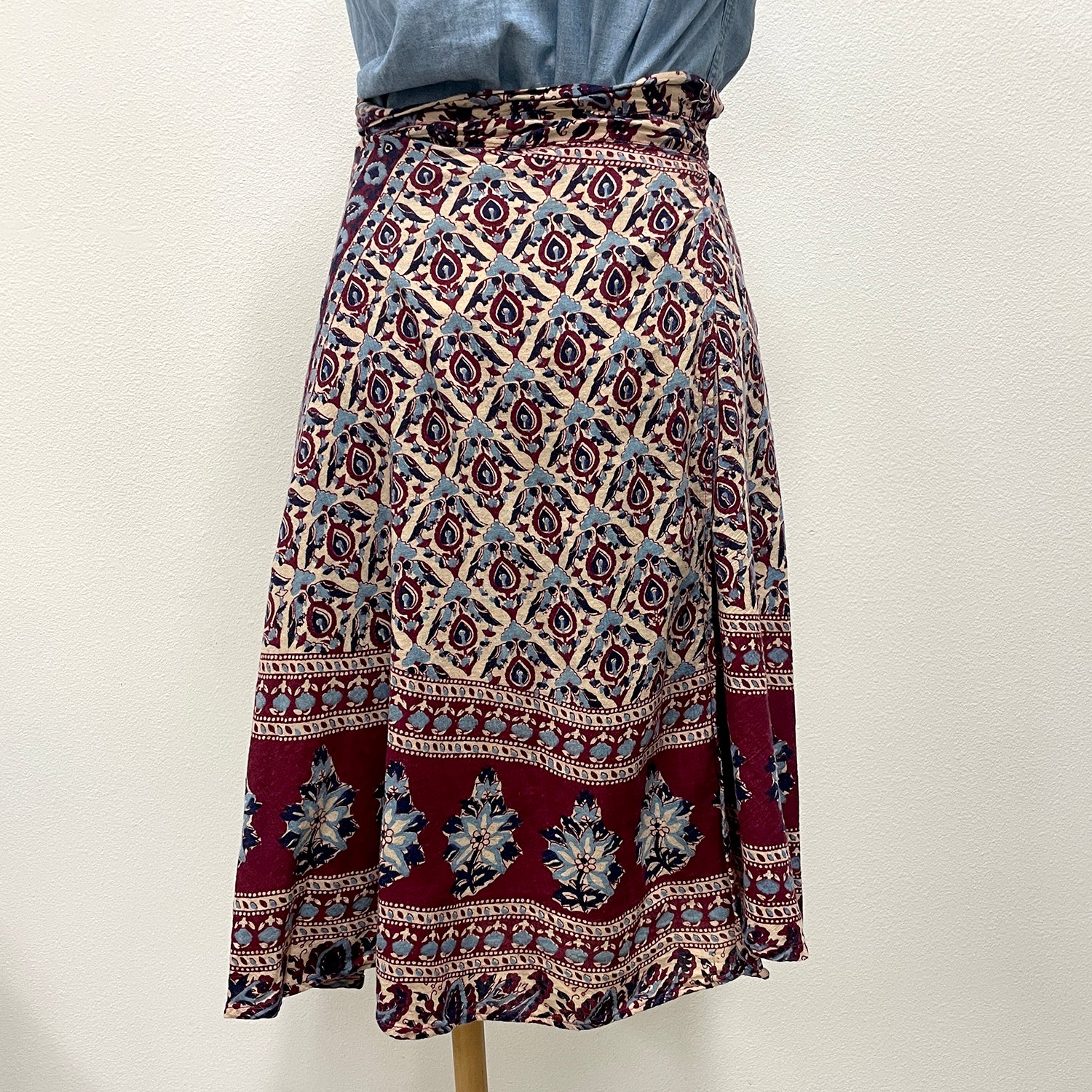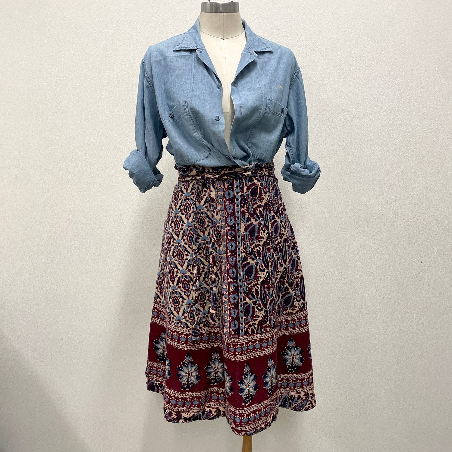 A block printed wrap skirt is one of our favorite vintage pieces. Easy to wear with tall boots or sandals. The wrapped waistband and overlapping full skirt can fit nearly any size.