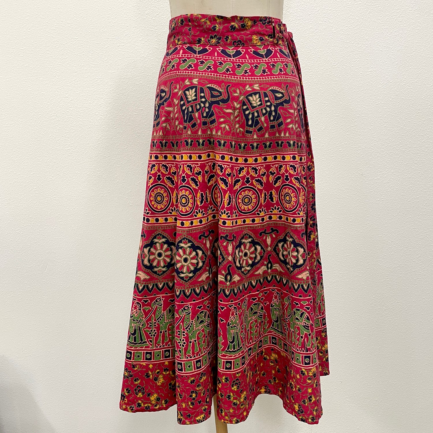 A gorgeous multi color printed wrap skirt, patterned with medallions, camels and elephants. The extra full skirt is long and easily wraps around nearly every size. This skirt can easily be dressed up or worn simply to elevate any outfit.